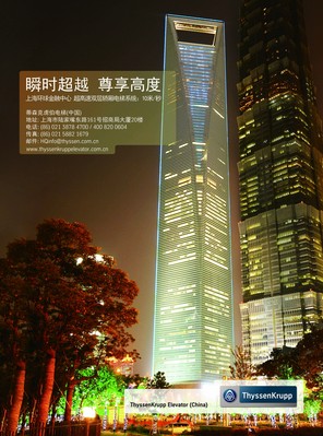 44臺性能卓越的蒂森克虜伯電梯安裝于上海環(huán)球金融中心內(nèi)