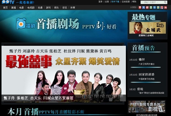 PPTV 網(wǎng)絡電視首播劇場涵蓋了目前市面上熱門的正版影視劇和電影,其中包含了湖南衛(wèi)視年度穿越大劇《宮》、2011年諜戰(zhàn)巨作《風雨》、經(jīng)典古裝探索續(xù)集《神斷狄仁杰》等。而本次強力上線的港式喜劇《較強喜事》則被網(wǎng)友們譽為集香港喜劇之大成作品,劇中主演古天樂首次嘗試扮演娘娘腔、甄子丹用“詠春拳”化妝、張柏芝產(chǎn)后首部復出作品以及杜汶澤男扮女裝搞笑演繹“忐忑”等看點都獲得網(wǎng)友們極高的關注,同時也成為該劇在 PPTV 網(wǎng)絡電視上收視創(chuàng)新高的佐證。