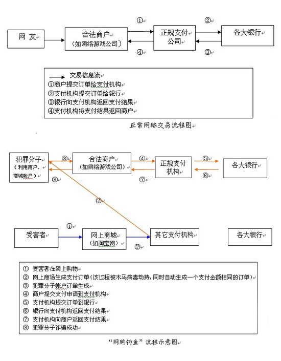 示意圖如上(如圖所示,“正規(guī)支付機(jī)構(gòu)”兩端的流程都是正常流程,無(wú)法分辨是騙子還是受害者;但“網(wǎng)上商城”、“合法商戶”有責(zé)任追索到騙子):