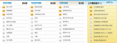 此外,PPTV 網絡電視影視導視專區推出了動態排行榜,該榜單根據 PPTV 網絡電視每日實際用戶點播影片次數進行由高到低的排名,涵蓋了電影、電視劇、動漫三個板塊的影片排行,及時展現了網民點播收看影片的動態排名情況,真實客觀地反映了網民在網絡電視收看平臺上的收視喜好,該榜單的發布即將成為下一代主流媒體、各大影視院線以及測評機構的重要參考指標。