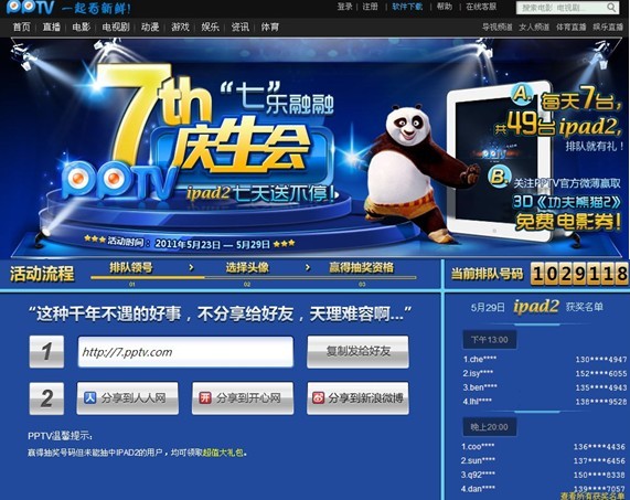 北京、上海和廣州2011年5月31日電 /美通社亞洲/ -- 5月23日至29日,一場以“PPTV‘七樂融融’慶生會,7天 iPad2 送不?!睘橹黝}的線上排隊慶生抽獎活動,在國內火熱展開。截止到2011年5月29日20:00活動結束時,參與人次高達1029118,超過100萬大關,成為網絡電視行業參與人數最多的一次線上網絡互動活動。同時,用戶參與的高漲熱情則成為7周年生日慶中 PPTV 網絡電視較好的生日禮物。