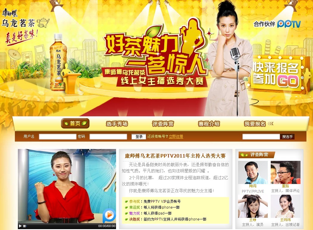 上海2011年6月1日電 /美通社亞洲/ -- 近日,PPTV 網絡電視(PPLive 旗下媒體,www.pptv.com)聯手康師傅烏龍茗茶,共同打造“好茶魅力,一茗驚人”2011年 PPTV 網絡電視線上女主播選秀大賽。這是繼 PPTV 網絡電視與第二屆中國達人秀、湖南衛視快女真人秀后,在娛樂領域展開的又一大型評選活動,最終的優勝者將成為 PPTV 網絡電視簽約主持人。(活動網址:http://zone.pptv.com/oolong-tea