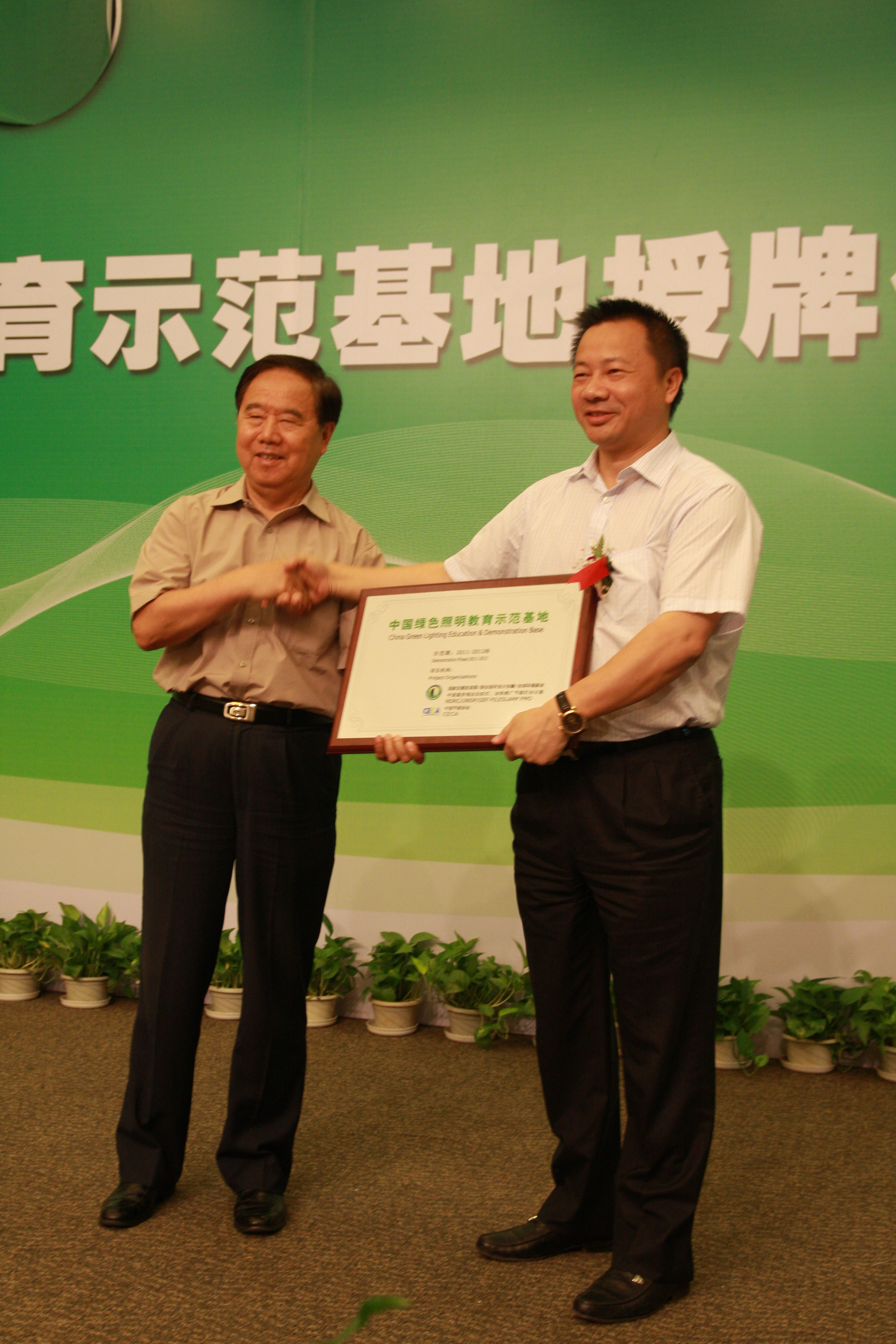 中國節能協會理事長傅志寰向雷士照明董事長吳長江授予“中國綠色照明教育示范基地”牌匾