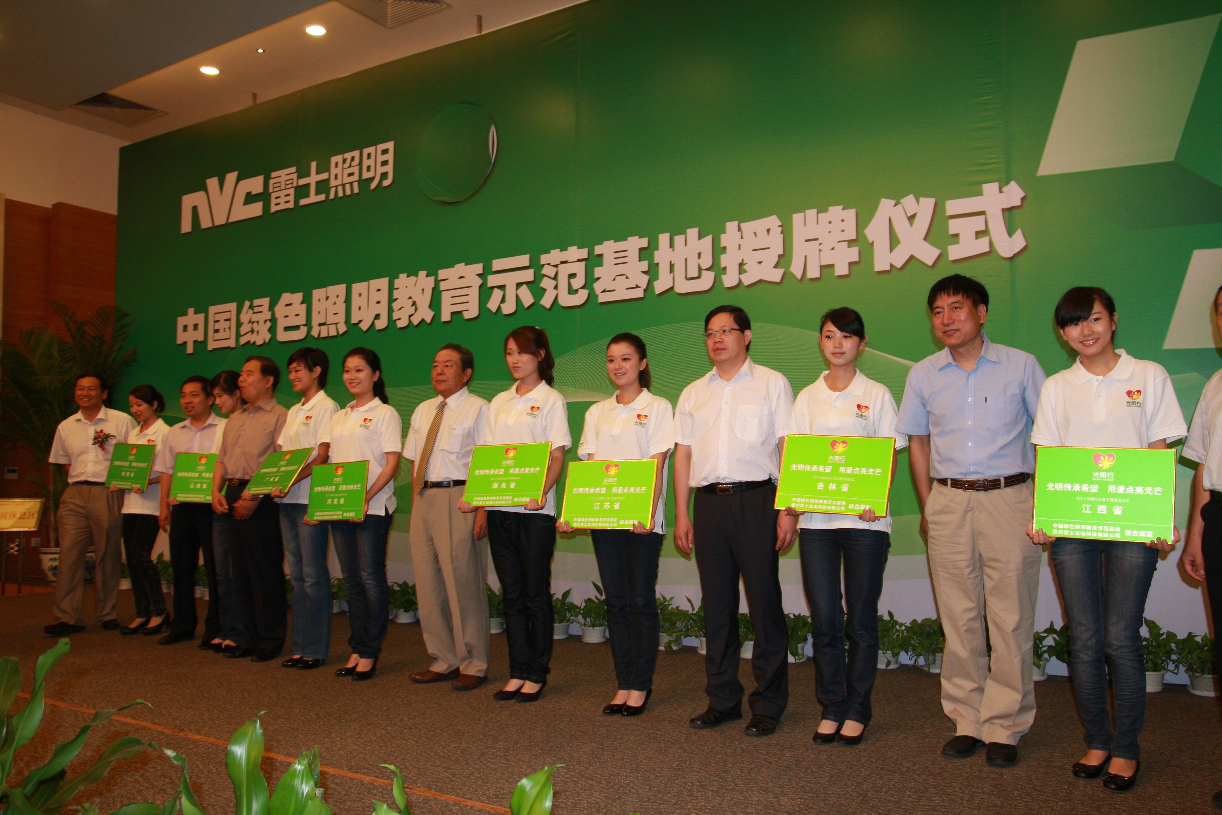 當天上午,為了做好綠色照明推廣和教育宣傳工作,向公眾深入傳播和普及綠色節能照明理念,現場主辦方還舉辦了“雷士照明光明行八省支教及照明產品捐贈儀式,國家發改委、國務院機關事務管理局、國家節能中心、北京節能環保中心、“逐步淘汰白熾燈、推廣節能燈”項目辦、中國節能協會等領導以及雷士照明董事長吳長江,一同上臺向雷士光明行八省支教志愿者頒發了愛心支教牌匾,宣告雷士“2011全國八省支教愛心及捐贈節能照明產品活動”正式啟動。