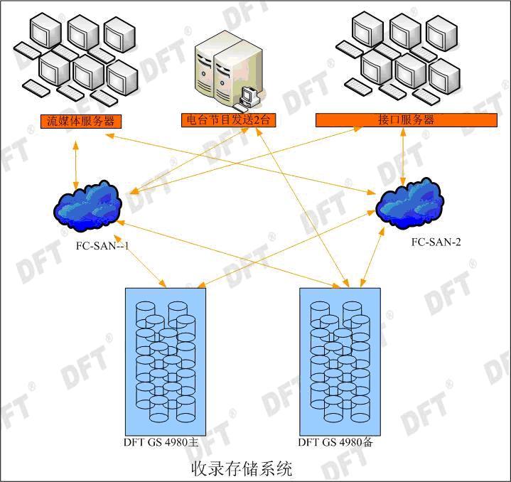 信息中心林主任表示:“在大樓建設初期,收錄系統(tǒng)中的數(shù)據(jù)都存儲在工作站中,安全問題存在很大隱患性,任何一臺服務器宕機,系統(tǒng)都將面臨數(shù)據(jù)全部丟失的風險。如何確保數(shù)據(jù)安全,成為新系統(tǒng)建設初期迫在眉睫需要解決的問題。根據(jù)客戶的特別要求,DFT 在其存儲解決方案中,存儲架構采用全冗余設計,通過主備交換機,將數(shù)據(jù)存儲到DFT磁盤陣列中,保證了鏈路和數(shù)據(jù)的安全性。目前 DFT 存儲產品可以滿足收錄系統(tǒng)的需求,并且在帶寬上還略有余量。”同時該存儲方案中又采用了 DFT GS 系列高端存儲產品,提供了滿足用戶需求的存儲帶寬,保障了存儲系統(tǒng)的穩(wěn)定性,提高了存儲系統(tǒng)高可用性。由于該產品還支持高達224TB 的存儲容量,為日后系統(tǒng)中增加節(jié)目提供了足夠的存儲空間,為整個收錄系統(tǒng)的穩(wěn)定運行提供了堅實的基礎。