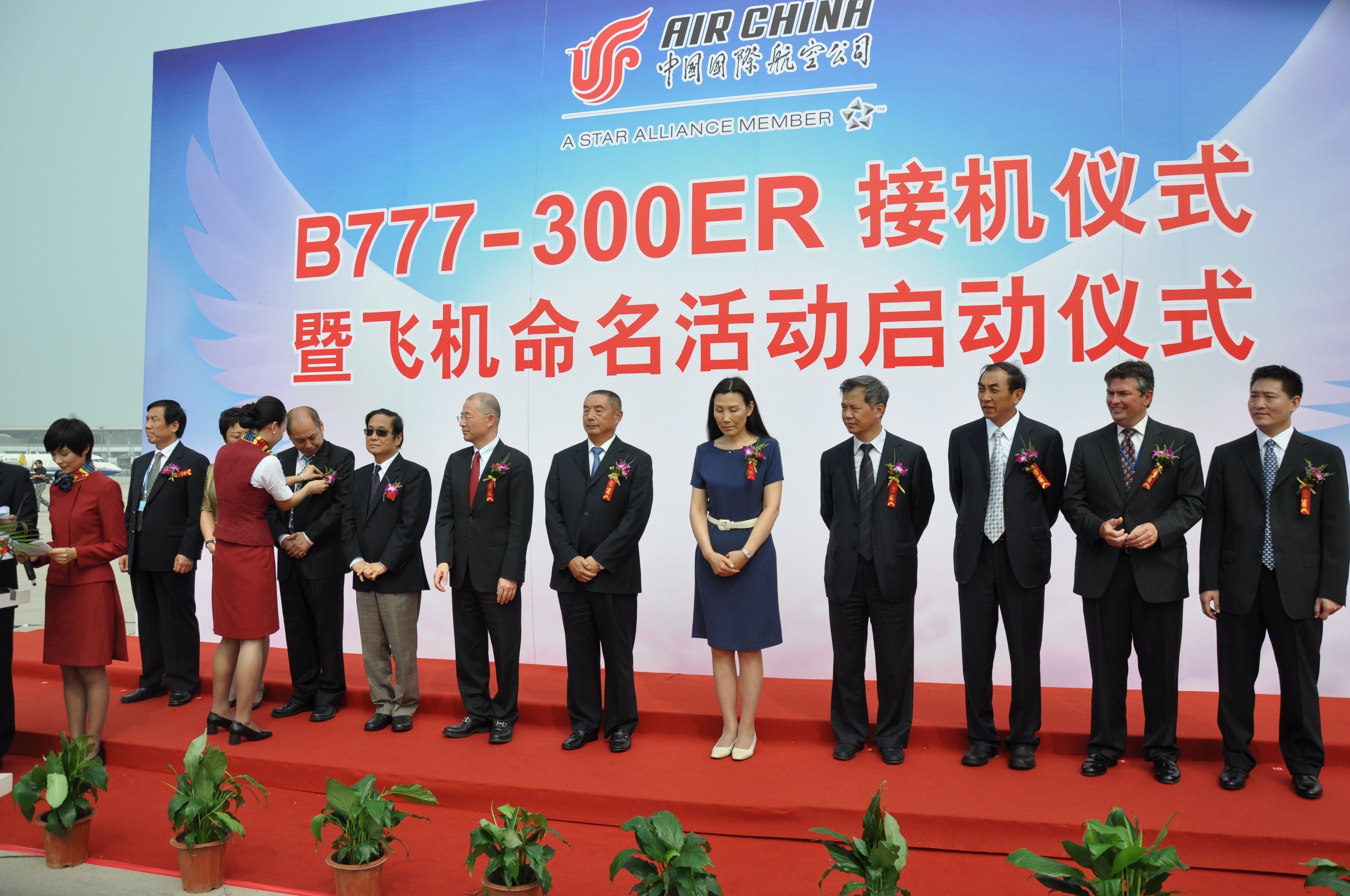 7月21日下午3時(shí),飛機(jī)抵達(dá)的同時(shí),國(guó)航在北京首都機(jī)場(chǎng)停機(jī)坪舉行了簡(jiǎn)單而熱烈的接機(jī)儀式。中航集團(tuán)總經(jīng)理、國(guó)航董事長(zhǎng)孔棟,中航集團(tuán)黨組書(shū)記、國(guó)航副董事長(zhǎng)王銀香,國(guó)航黨委書(shū)記樊澄,國(guó)航副總裁賀利、王明遠(yuǎn),國(guó)航黨委副書(shū)記馮潤(rùn)娥,國(guó)航總經(jīng)濟(jì)師許建強(qiáng)等出席儀式。首都機(jī)場(chǎng)股份公司總經(jīng)理張光輝等駐場(chǎng)單位代表和波音公司代表到場(chǎng)祝賀。藝術(shù)大師、國(guó)航標(biāo)志的主要設(shè)計(jì)者韓美林與首航機(jī)長(zhǎng)、乘務(wù)長(zhǎng)共同為飛機(jī)命名活動(dòng)揭匾。國(guó)航常旅客代表還在儀式上暢談了全程體驗(yàn)的美好感受。