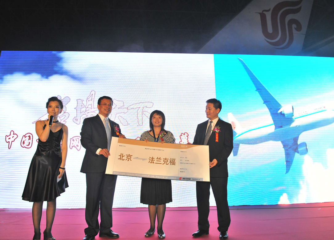 國航副總裁王明遠與波音(中國)傳播事務副總裁王玉奎共同敲響揭幕鑼鼓。伴隨著全場倒計時、激動人心的樂曲和絢爛燈光,懸掛在飛機機身的紅綢飄揚而起,噴涂于飛機機身尾部,由300名國航微博粉絲頭像組成的“追夢者”三字赫然映入全場嘉賓眼簾,全場掌聲雷鳴。王明遠親自向優勝者頒發了命名活動優勝獎 -- 兩張北京至法蘭克福往返機票,而此架飛機也將于9月1日起,攜同已經于8月投入運營的另一架國航新引進的 B777-300ER 飛機共同執行北京至法蘭克福航線?;顒蝇F場,國航還特意安排與會嘉賓登機體驗,并品嘗頭等艙、公務艙餐食和美酒。網友們也在現場弦樂隊的美妙樂曲中與自己命名的飛機共度了一個輕松美好的夜晚。