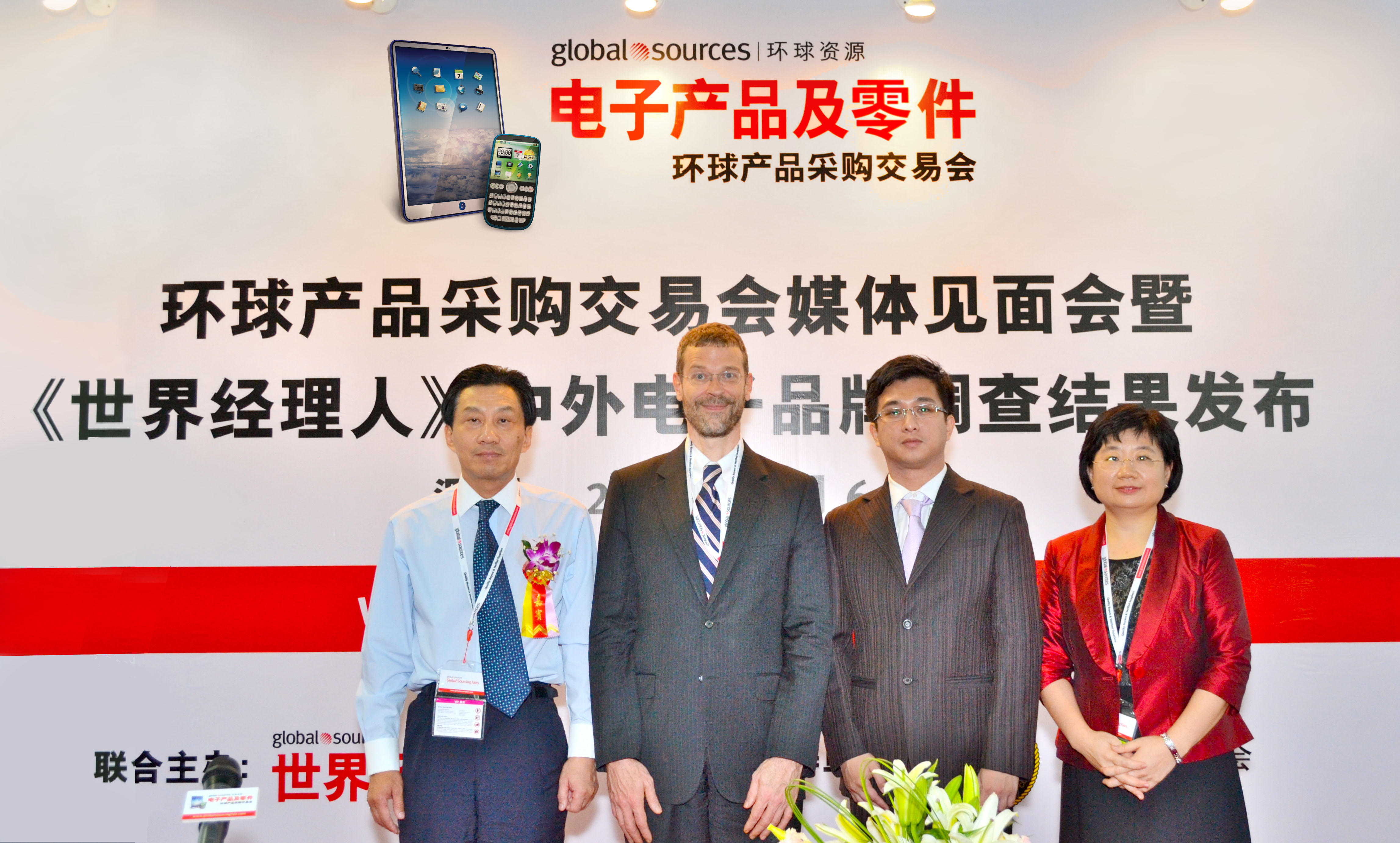 環球資源旗下《世界經理人》雜志出版人裴克為先生(左二)、環球資源中國內貿發展部副總裁任麗峰女士(右一)、中國電子商會常務副會長王寧先生(左一)和深圳敏恒科技有限公司董事兼副總經理馮恪先生(右二)在“環球產品采購交易會媒體見面會暨《世界經理人》中外電子品牌調查結果發布會”上合影。