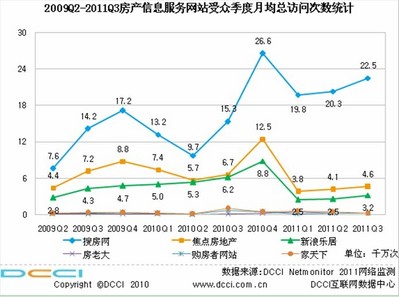 DCCI Netmonitor 2011網(wǎng)絡(luò)監(jiān)測(cè)數(shù)據(jù)顯示,2011年第三季度,搜房網(wǎng)等房產(chǎn)信息網(wǎng)站的用戶月均總訪問次數(shù)繼續(xù)出現(xiàn)上升,其中搜房網(wǎng)2011年第三季度的月均總訪問次數(shù)達(dá)到22.5千萬次,位列房產(chǎn)信息網(wǎng)站的首位,領(lǐng)先第二名近5倍。