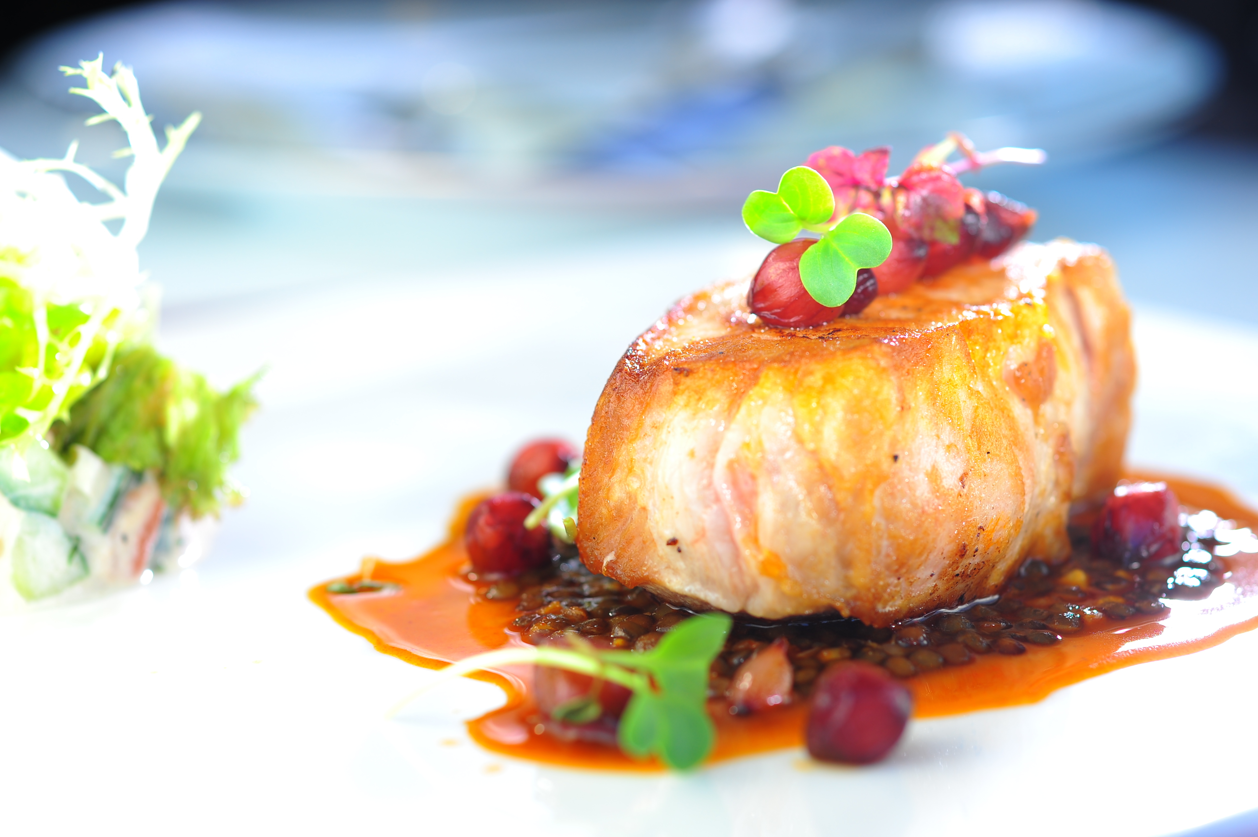 面對珍稀食材,Le 188°餐廳及酒廊主廚希艾力 Eric Heijkoop 施展渾身解數,以國寶級的黑毛豬肉,編制演繹八款精致菜式,從頭盤、主菜到甜點,每一道菜式均一絲不茍地烹調并細致呈獻。慢煮西班牙黑毛豬則是主廚的首道力作,希艾力采用法國真空慢煮方式,將黑毛豬肉以攝氏四十五度慢煮四十八小時,令肉質內外均衡,保持水份,同時加入紅酒洋蔥、羅勒及紅咖哩蘭度豆汁,成就此款不可多得的經典主打菜式。而香煎西班牙黑毛豬配照燒菠蘿、西紅柿沙律及牛仔汁則是黑毛豬的另一精彩演繹。自制甜甜酸酸的菠蘿與牛仔汁從香脆的黑毛豬肉外層緩緩滲入內層,提升肉質散發的橡子幽香,甜酸而甘香,口感濃郁細膩,層層相扣,更是秋冬季節的開胃佳肴。