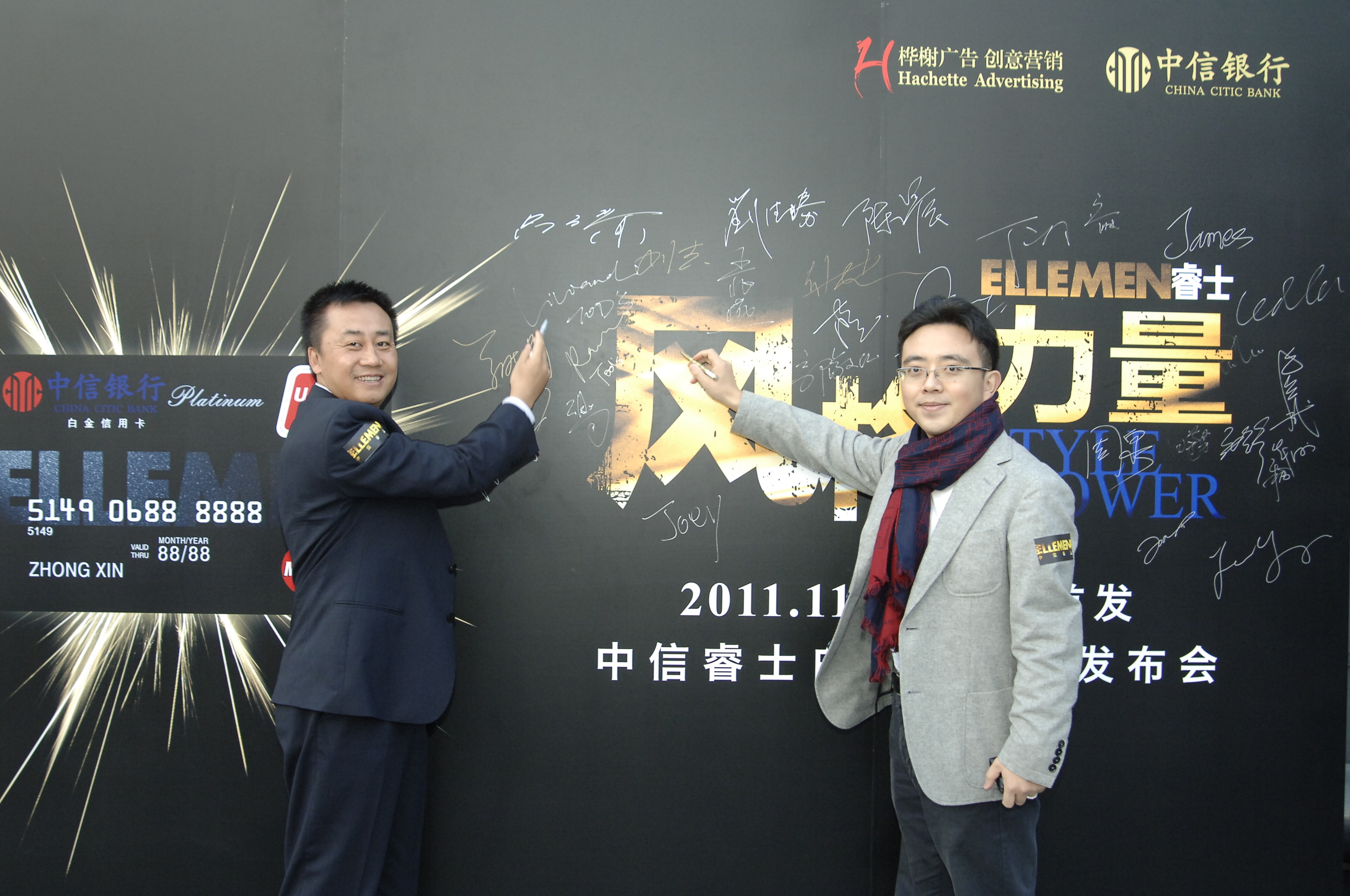 作為“創意營銷”的倡導者,樺榭中國為這張“爺們兒”的信用卡召集了群英薈萃的中信睿士顧問團,涵蓋了豪車、賞表、品酒、投資、攝影、健身、旅游、時裝等當下品位男士熱衷的各個領域。中信睿士信用卡將以男士的興趣愛好為持卡權益切入點,以各行業泰斗翹楚為顧問網絡,力求為信用卡持有人建立符合自己消費喜好和生活志趣的交際圈。發布會現場隆重推出首批7位顧問團代表暨中信睿士白金信用卡持卡人:豐實資本控股有限公司董事長盧長祺、《Car and Driver 名車志》創意總監兼首席攝影師劉杰、鐘表收藏界泰斗及德國Chronos雜志中文版《Chronos手表》發行人兼主編丁之向、ASC Fine Wines大中華區葡萄酒教育和培訓經理,葡萄酒講師,專欄作者郝利文、《ELLE MEN睿士》編輯總監李寶劍、中國超跑車隊理事長,第一支參加國際頂級GT比賽中國車隊負責人嚴路、全國十佳健身先生,國際健身大會培訓師朱曉輝等7位風范一代意見領袖。