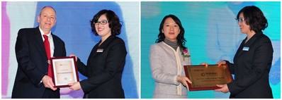 加拿大加鼎基金公司商業(yè)移民部經(jīng)理、加拿大魁省移民局駐香港辦事處前局長 Mr. Gilles Cyr 以及匯豐銀行加拿大基金公司副總裁劉麗芳女士為上海華僑移民公司頒獎