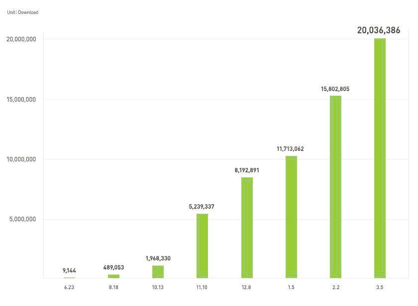 結(jié)果是在下載量達到1500萬后僅一個月的時間里再增500萬,自服務(wù)開始后8個月內(nèi),累計下載量達到了2000萬次。