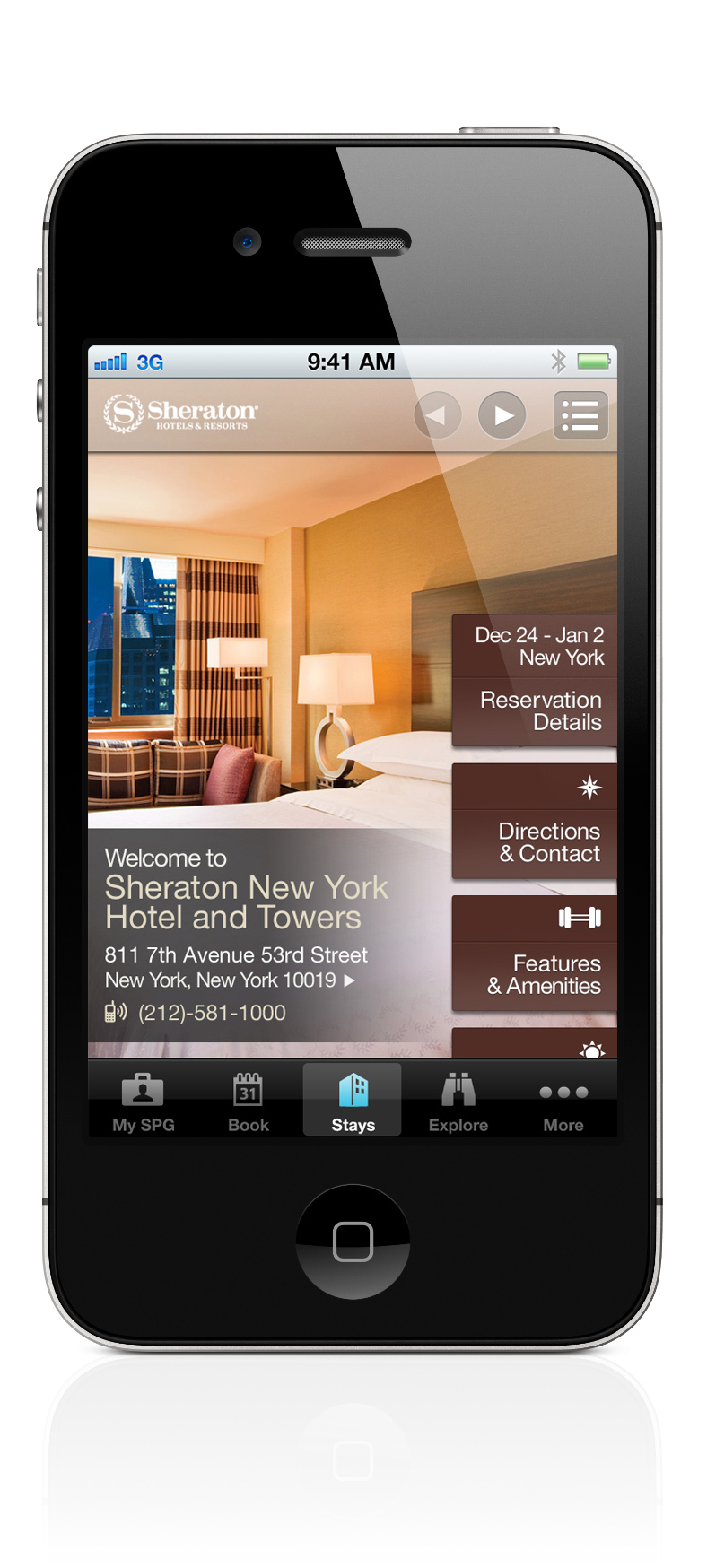 SPG 應用程序是率先使用狀態感知技術的應用程序之一,通過先進技術打造出智能界面,將喜達屋旗下九大獨特的生活品牌及其近1100家酒店與度假村完美聯合起來,堪稱開創旅游業之先河。根據計劃出游、前往酒店途中以及已登記入住等用戶狀態,SPG 應用程序可具體調整程序的外觀、感覺和內容等。旅客在預訂抵達酒店前48小時會收到程序發出的提醒通知;而“我的住宿”界面會出現一系列反映入住品牌與酒店特色的變化,其中包括通過主畫面直接獲取酒店地址(英文及當地語言兩種形式)、天氣、方向以及酒店設施等重要信息。抵達酒店后,旅客即可獲得客房號、酒店內外用餐及活動推薦、FourSquare與Facebook等社交媒體網站的程序自帶鏈接等。