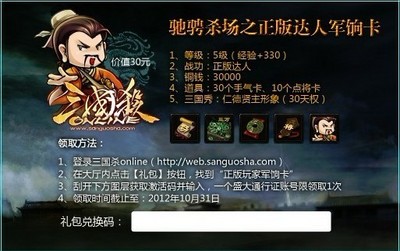 今年即將舉行的第十一屆三國殺王者之戰中將全面啟用新的三國殺3v3競技規則,并啟用新的三國殺3v3專用牌。同時,在新一版,也就是2012版三國殺3V3專用牌中內含第十一屆三國殺王者之戰的報名卡一張。此卡將在王者之戰官網(http://king.sanguosha.com)報名參賽時使用。另外,除常規贈送的閃卡外,在2012版三國殺3V3專用牌中還隨贈三國殺online正版達人軍餉卡,做為游卡桌游對長期支持正版的玩家的達謝。