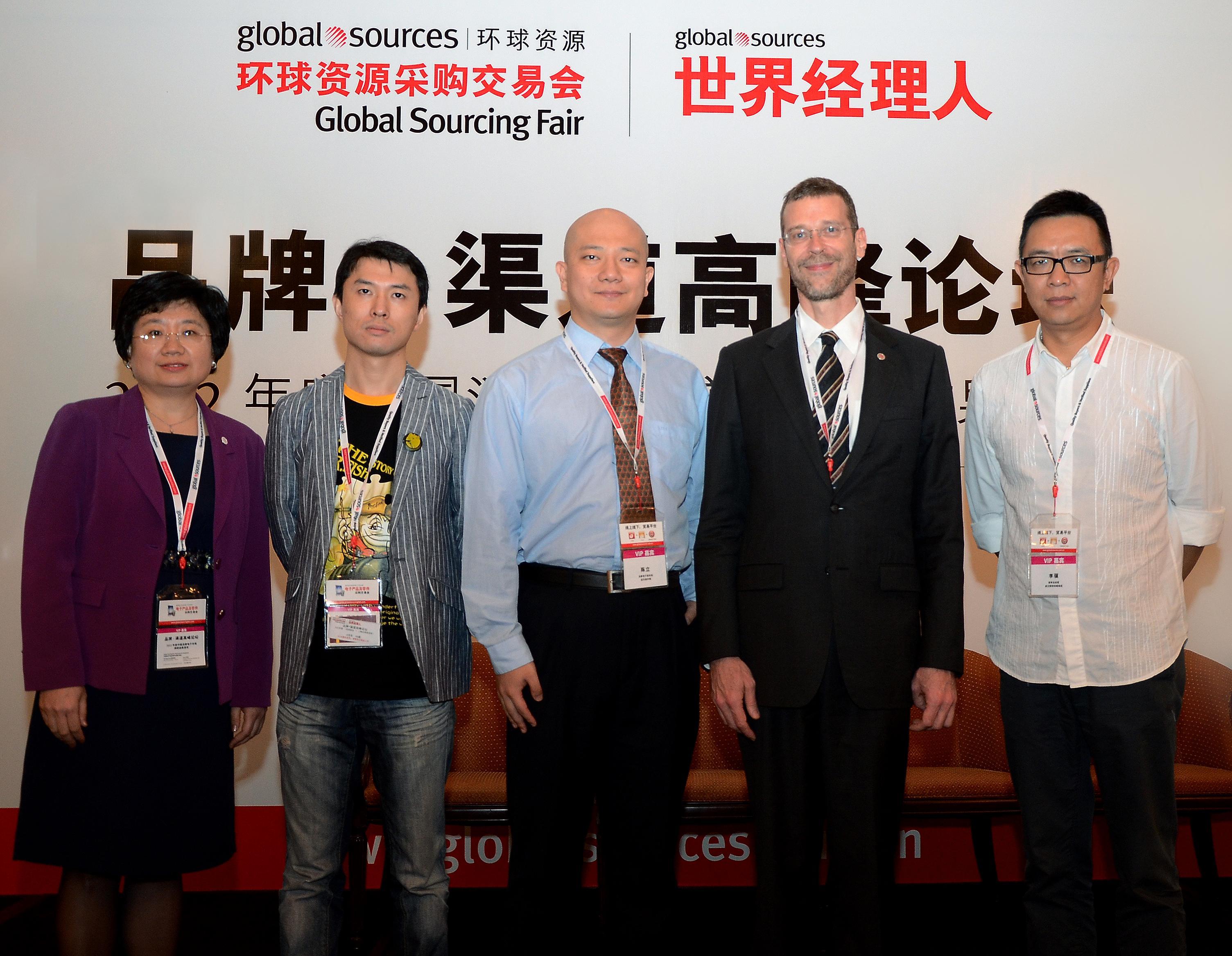 主辦方環球資源中國內貿發展部副總裁任麗峰女士(左一)、環球資源企業事務總裁兼《世界經理人》雜志出版人裴克為 (Craig Pepples) 先生(右二)與亞馬遜產品總監陳立先生(中)、威漢營銷傳播集團董事總經理李驥先生(右一)、品牌展商代表深圳市子非魚文化傳播有限公司總經理余曉峰先生(左二)在環球資源“品牌.渠道高峰論壇”上合影。
