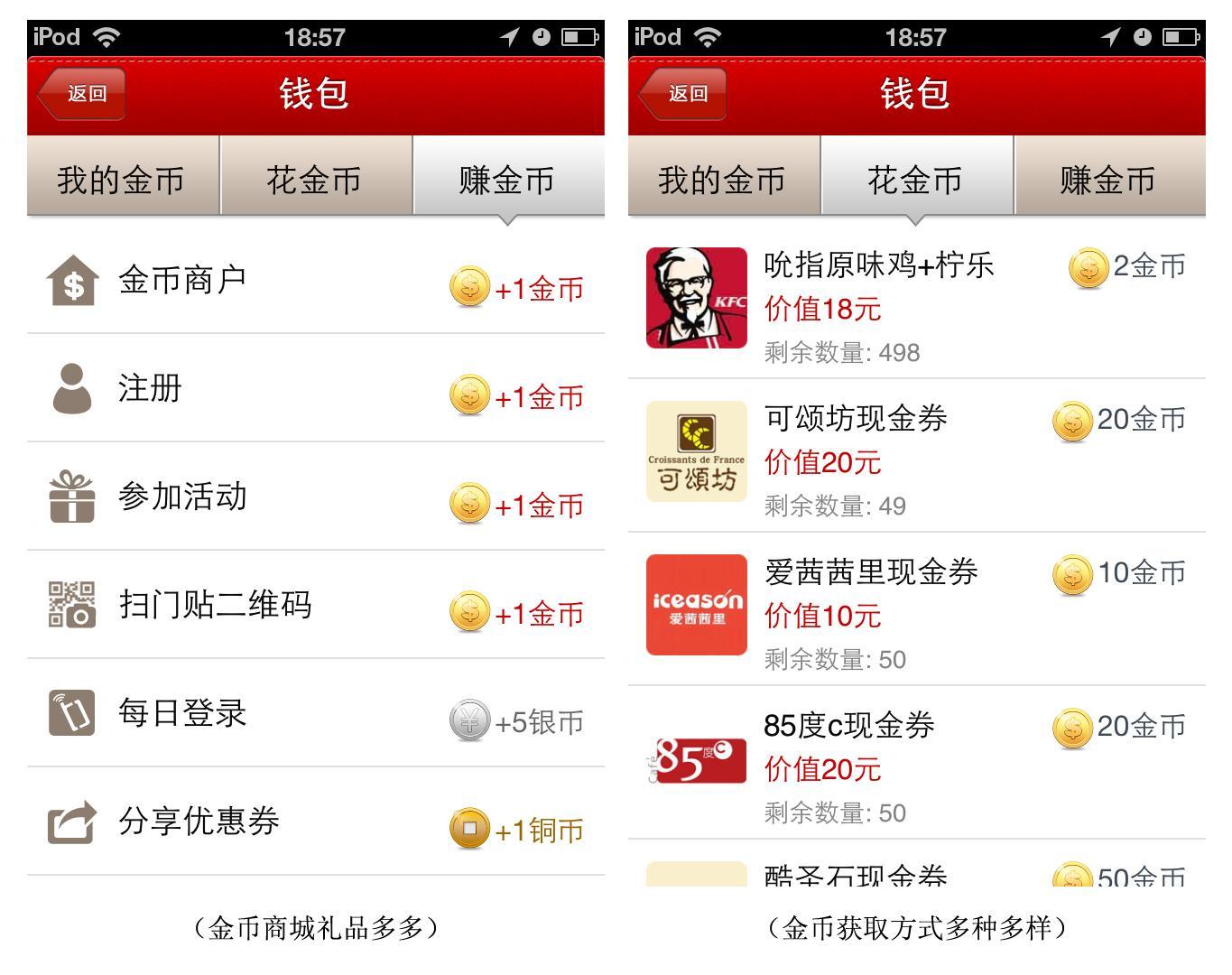 那么怎么獲得金幣呢?其實(shí)很簡(jiǎn)單,金幣的獲取也都是免費(fèi)的。例如,注冊(cè)新用戶(hù)可以獲得1金幣;每天首次登陸就有5銀幣到手;掃描商戶(hù)的二維碼門(mén)貼就有1金幣進(jìn)賬;通過(guò)短信或微博分享優(yōu)惠券也能賺到1銅幣。
