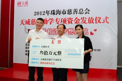 珠海2012年7月12日電 /美通社亞洲/ -- 7月11日,由珠海市慈善總會、珠海電視臺、全球較大通用耗材制造商天威之珠海旗艦工廠——天威飛馬打印耗材有限公司聯合成立的“天威慈善助學專項資金”,正式啟動2012年度資助計劃,接受來自全國各地珠海戶籍貧困學子的資助申請。