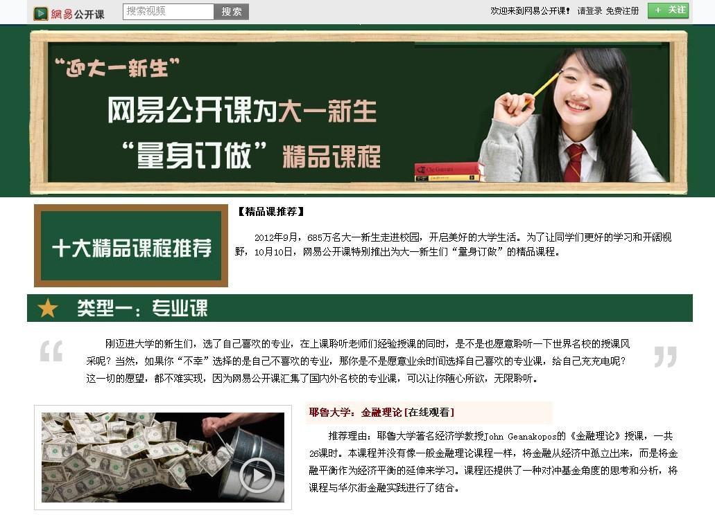 10月11日,網易公開課針對大一新生,特別推出了以上“量身訂做”的精品課程。該課程涵蓋專業課、基礎課、公共課、興趣課四大部分,多方面的給大一新生提供學習和生活支持。網易公開課相關負責人表示:“網易公開課現有幾十所國際國內大學的課程、TED演講以及可汗學院,以后還會增加更多優秀課程,努力打造成網上綜合大學。”
