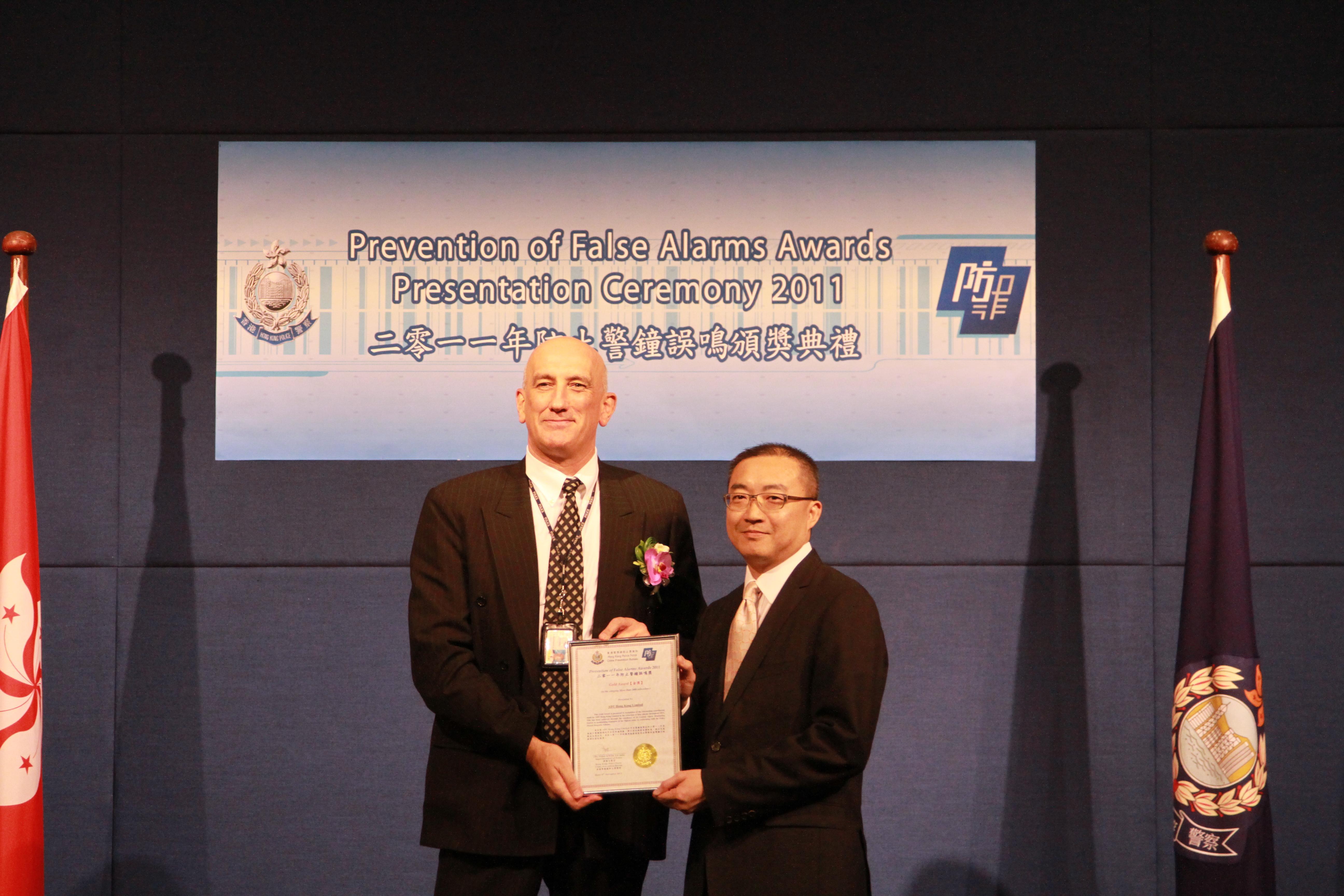 ADT安防香港與澳門地區(qū)總經(jīng)理 Edmond Cheung 接受總警司 S.A Carruthers 先生頒獎。