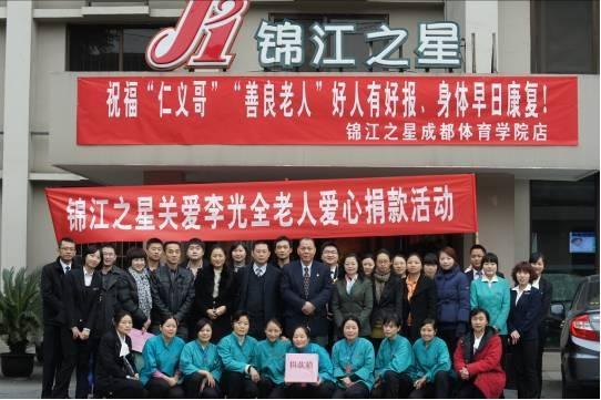 四川2012年11月29日電 /美通社/ --錦江之星成都體育學院店近日接待了“善良老人”李光全。同時,錦江之星四川的各連鎖酒店紛紛組織店內捐款儀式,共有近300名員工參加捐款,籌得善款8010.5元。