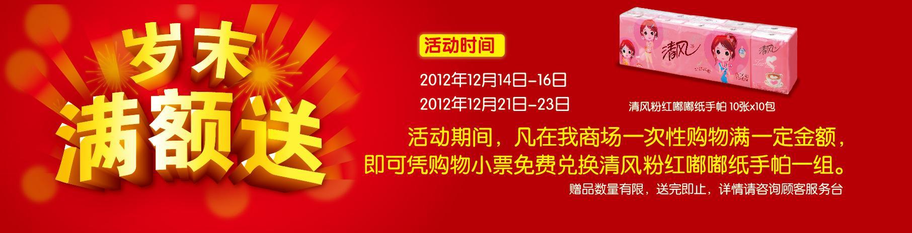 為了回饋顧客,全國范圍的沃爾瑪購物廣場還推出“歲末滿額送”活動。12月14日至16日、12月21日至23日,凡在沃爾瑪購物廣場購物滿一定金額,即可憑小票免費兌換清風粉紅嘟嘟紙手帕一組(以店內海報或顧客服務臺咨詢為準,贈品數量有限,送完即止)。