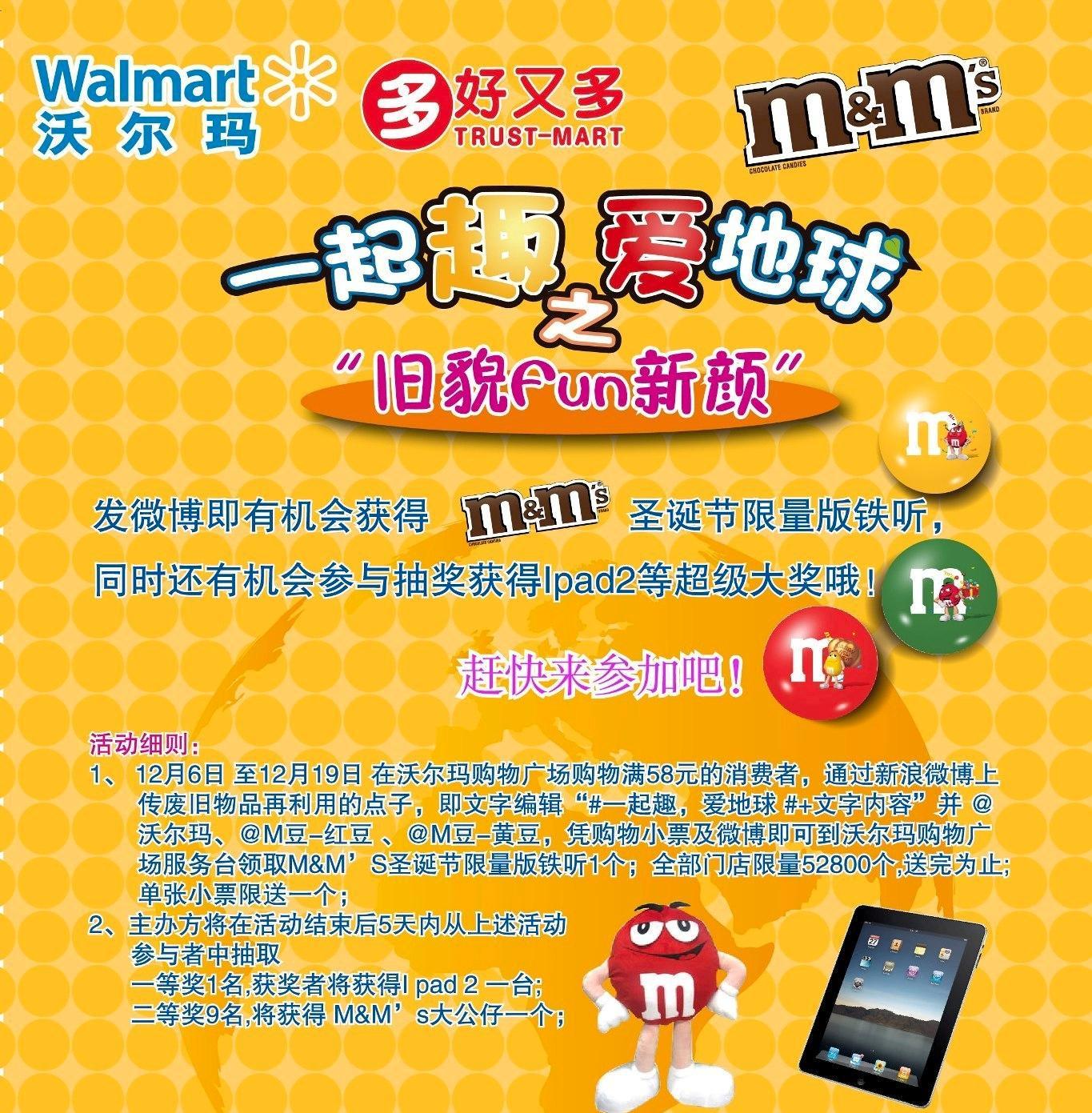 天冷了,宅在家里參加沃爾瑪與瑪氏公司共同推出的一起“趣”愛地球的微博活動,也是別有一番樂趣。即日起至12月19日,顧客在沃爾瑪和好又多門店購物滿58元后,通過微博上傳廢舊物品再利用的點子,即編輯文字“#一起趣,愛地球#+文字內容”,并@沃爾瑪、@紅豆-Red、@黃豆-Yellow,便可以憑購物小票和微博到沃爾瑪和好又多門店服務臺領取m&m's圣誕節限量版鐵聽1個(全國門店限量52800個,送完即止,單張小票僅限送一個,詳情請見店內海報或到顧客服務臺咨詢)。活動結束后5天內,從上述活動參與者中還將抽取一等獎1名,送出 iPad2一臺;二等獎9名,分別送出 m&m's 大公仔一個。