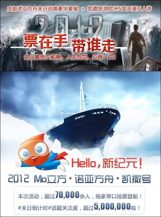2012年12月17日,末日倒計時5天,Mo立方迎合時下熱門的世界末日話題,攜手“拯救休閑時光”的成都諾亞方舟酒店,以及“歐洲旅游專家”凱撒旅游成都分公司,推出聯合微博營銷活動“票在手,帶誰走”,參與活動的用戶即可獲得諾亞方舟酒店的限量船票,更有機會贏取凱撒旅游成都分公司價值20000多的歐洲5國11日豪華浪漫雙人游。