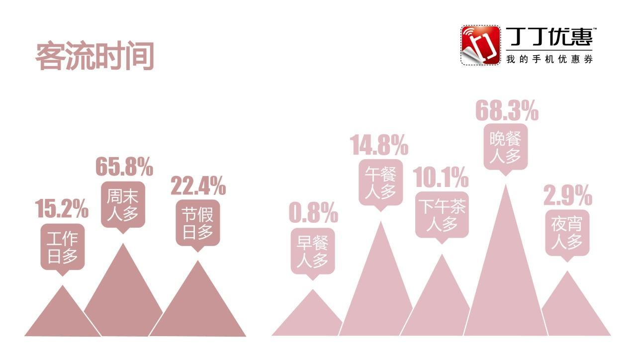受都市白領(lǐng)休閑作息規(guī)律影響,餐飲店客流呈現(xiàn)日晚餐高峰和周六日節(jié)假日雙高峰表現(xiàn),其中60%以上客流來(lái)自于這兩個(gè)時(shí)段。調(diào)查也發(fā)現(xiàn),對(duì)于某些邊際市場(chǎng)的空間還有待挖掘,比如高新科技園區(qū)和工業(yè)園區(qū)甚至某些高密度寫(xiě)字樓商圈,白領(lǐng)高密度聚集地需求量相應(yīng)旺盛,午餐雖單次消費(fèi)總額不高,但是勝在量大。