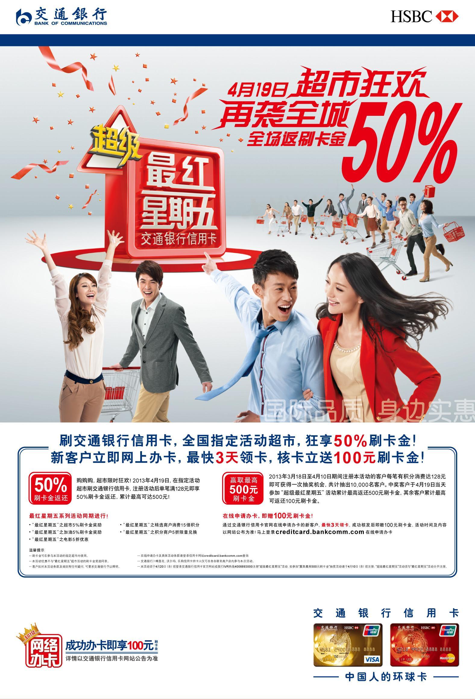 上海2013年3月19日電 /美通社/ -- 自“超級最紅星期五”去年創下單日消費總額20億元的紀錄后,4月19日,交通銀行信用卡“超級最紅星期五”將全民狂歡,再襲全城!屆時,交通銀行信用卡將攜手全國3000家超市,為持卡人提供全場返50%刷卡金的優惠盛宴,較高500元。這場專屬交通銀行信用卡用戶的購物盛宴,勢必將掀起“五一”長假前第一波“暢刷”狂潮。