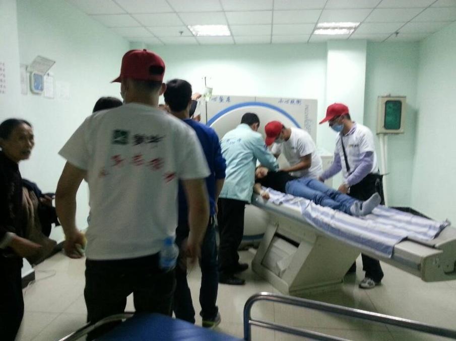 蒙牛志愿者協助醫護人員將傷者從救護車運送至醫院