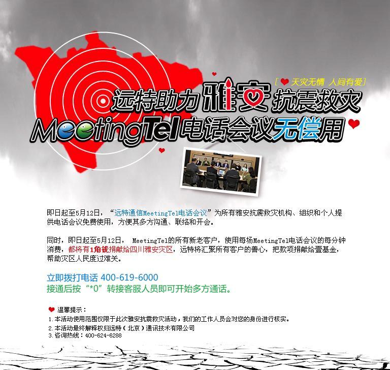 MeetingTel 電話會議的每分鐘消費,都將有1角錢捐獻給四川雅安災區(qū)