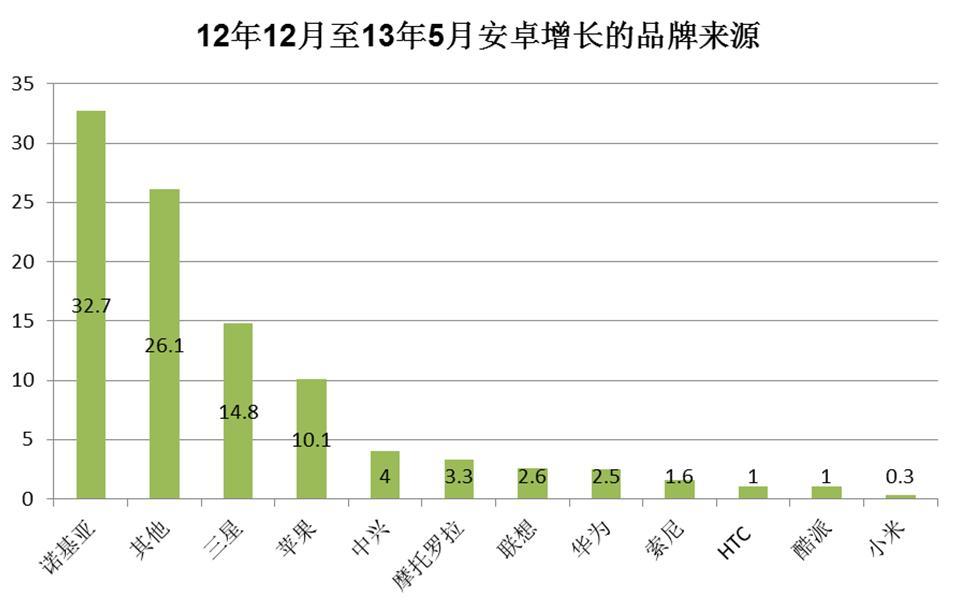 據 Kantar Worldpanel ComTech 移動通訊消費者指數的研究數據,安卓在中國城市的發展很大一部分歸功于原諾基亞用戶。自去年12月以來的六個月中,購買安卓手機的用戶中有三分之一來自諾基亞,成為安卓在近期成長的較大動力。研究同時發現,安卓的壯大不僅僅是來自功能機的升級,同時很多用戶贏得于競爭對手 iOS。在同期有百分之十的新安卓用戶曾經使用過蘋果手機,剩余的新用戶則來自市場份額較小的品牌,和國產二線品牌。