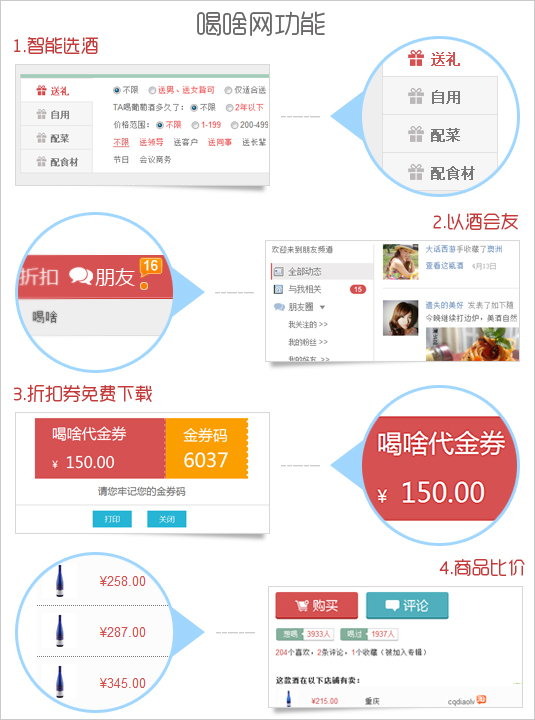 葡萄酒知識分享導購社區hesha.com喝啥網7月推出新版。新版增加了智能選酒功能,強化了社區互動并推出了嶄新的版塊如免費代金券下載“折扣”頻道,以酒交友“朋友圈”,葡萄酒知識文庫“學品酒”,美酒美食搭配和酒莊旅行圖片分享的“專輯”頻道等。