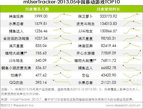 艾瑞根據(jù)mUserTracker數(shù)據(jù)整理發(fā)現(xiàn),TOP10榜單中,以《神廟狂奔》、《水果忍者》、《保衛(wèi)蘿卜》等輕游戲產(chǎn)品的用戶人數(shù)和時(shí)長(zhǎng)較高,游戲門檻低,操控性更適宜移動(dòng)終端小屏幕。而其他如《JJ斗地主》、《QQ農(nóng)場(chǎng)》等游戲,憑借線下及PC端游戲的延續(xù)性,同樣獲得了移動(dòng)游戲用戶的青睞。總體而言,休閑性的游戲更容易獲得移動(dòng)用戶接受。