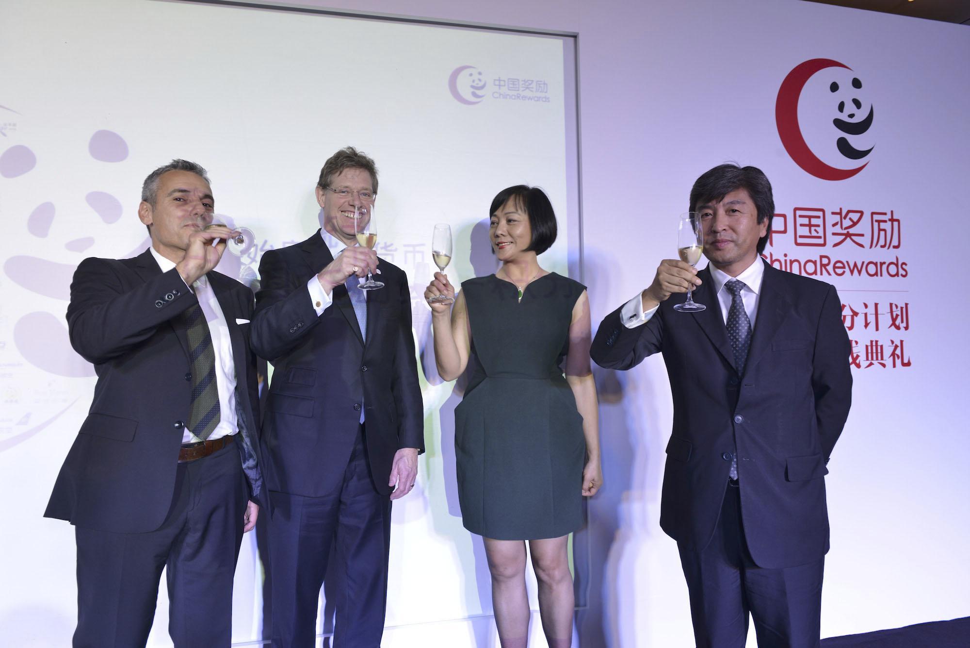舉杯慶賀中國獎勵統一積分正式上線(左1:Points總裁Christopher Barnard先生、左2:AIMIA首席執行官Rupert Duchesene先生、右1:銀聯商務總裁李曉峰先生、右2:中國獎勵首席執行官吳限女士)