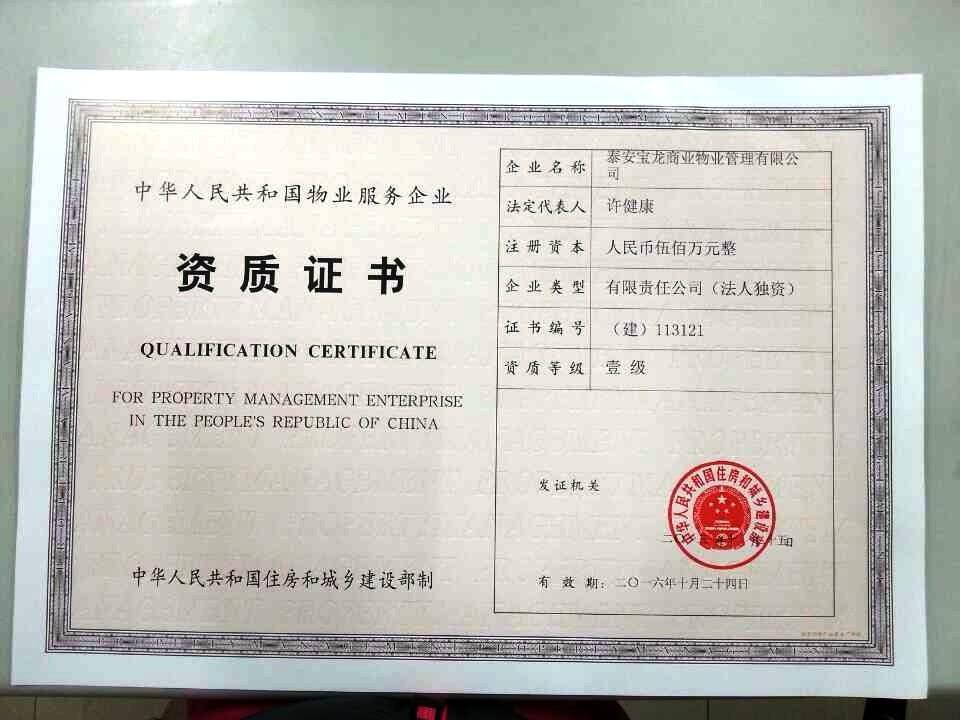 泰安寶龍商業物業管理有限公司物業一級資質證書