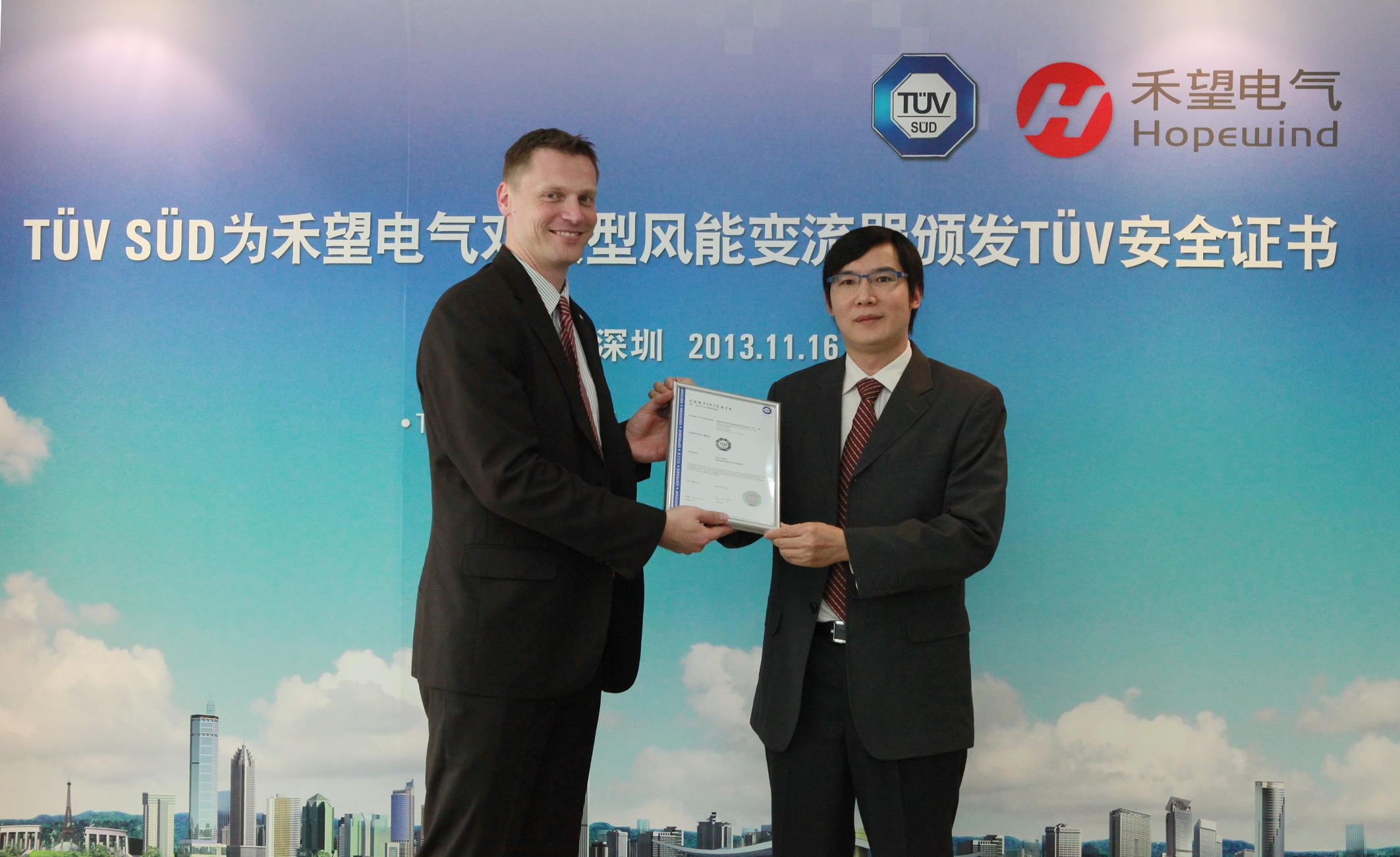 深圳2013年11月18日電 /美通社/ -- 2013年11月14日,TUV南德意志集團(tuán)(以下簡稱TUV SUD)為深圳市禾望電氣有限公司(以下簡稱禾望電氣)旗下雙饋型風(fēng)電變流器頒發(fā)了TUV SUD安全認(rèn)證證書,TUV SUD大中華區(qū)高級副總裁Wolfgang Hubl先生、禾望電氣研發(fā)中心總監(jiān)周黨生先生出席了頒證儀式。