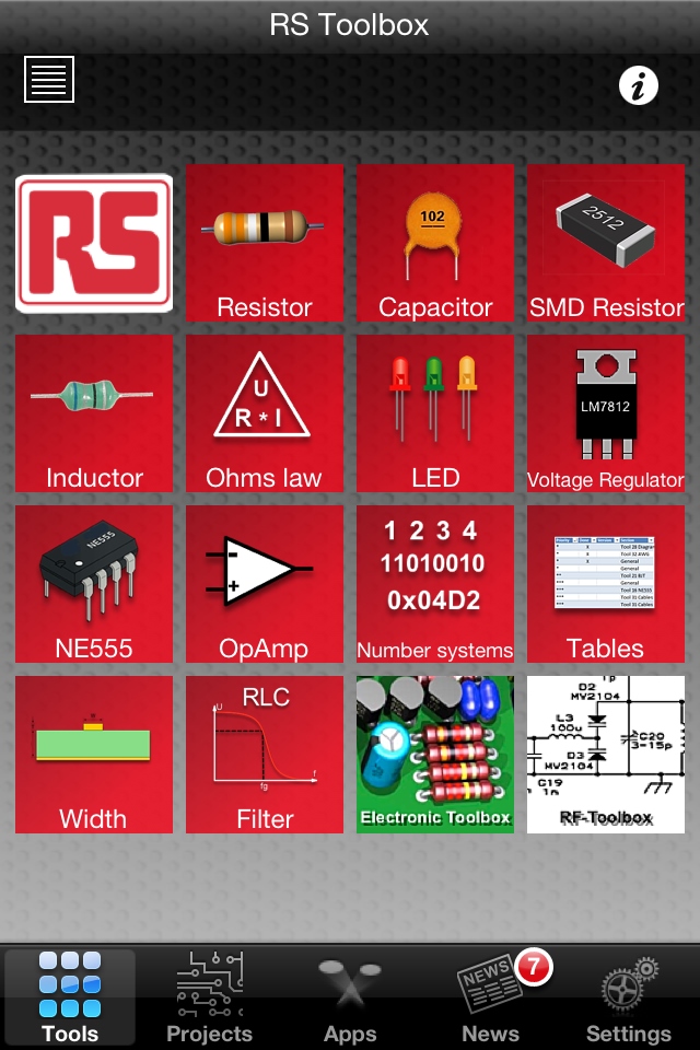 RS Toolbox 提供一系列廣泛的功能,均以圖標形式在主屏幕上分組呈現,包括多種工程計算器、轉換器和查詢表。例如RLC濾波計算器,555定時配置器,用于各種穩壓器運算放大器的計算器,以及諸如編號系統轉換器和歐姆定律計算器等基本工具,還有包括電池類型與尺寸、電纜顏色編碼、封裝尺寸和螺線管規格等內容的查詢表。