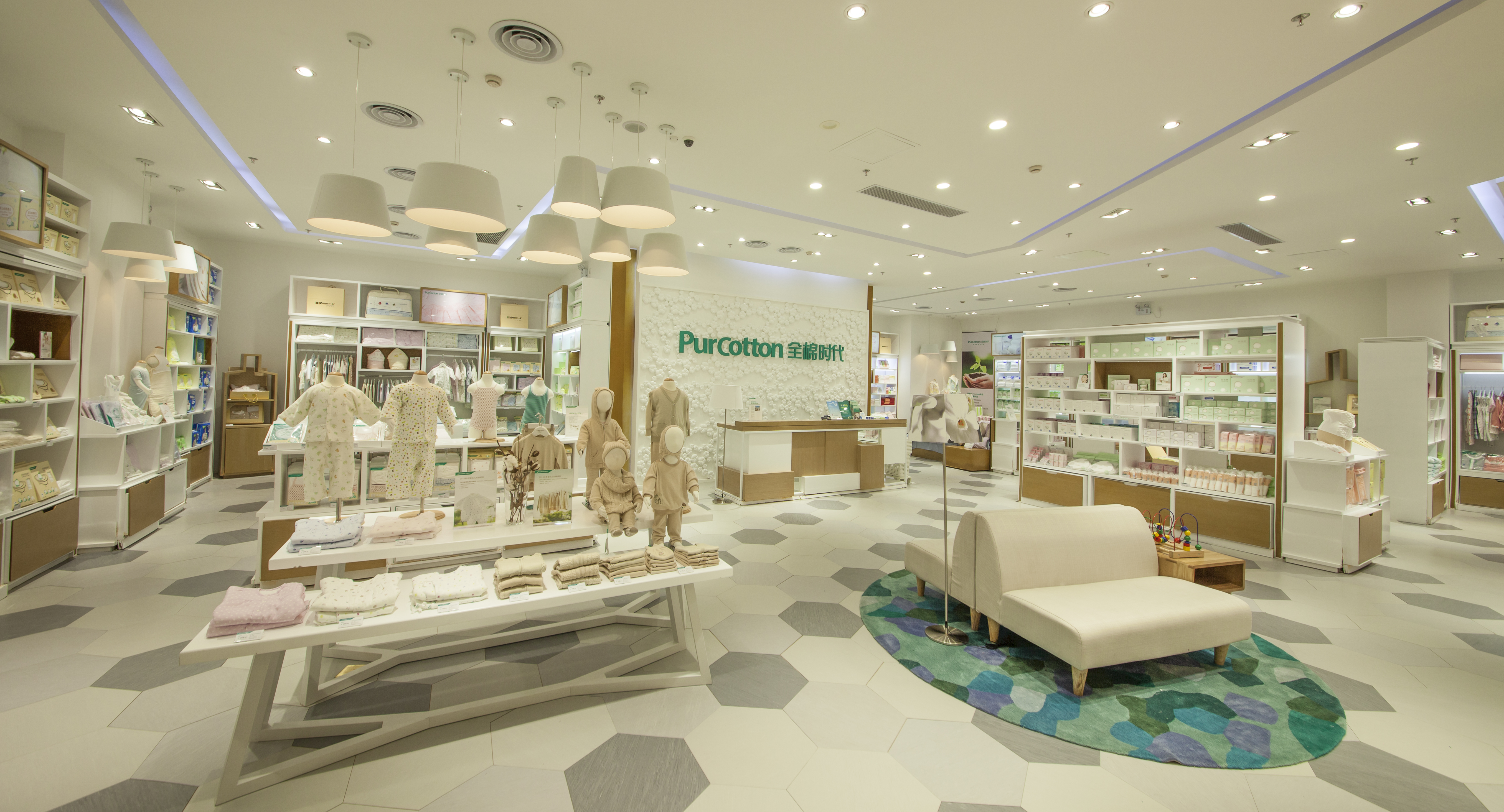 全棉時代武漢光谷世界城旗艦店總面積近320平方米,目前是全棉時代全國較大門店。店內(nèi)分設(shè)棉品展示區(qū)、顧客休息區(qū)以及兒童玩具區(qū)、育嬰室等,全方位地為消費者打造精致完美而不失愜意舒適的購物空間。淡雅輕盈的色澤,明亮開闊的空間,店內(nèi)設(shè)計淋漓盡致地展現(xiàn)了全棉時代專賣店一貫的溫馨怡人的舒適氛圍。揉合了豐富專業(yè)的醫(yī)學(xué)級品質(zhì)內(nèi)涵與棉品從容悠閑的獨特氣質(zhì),處處喚起人們對自然生活的不斷追求,簡約之中傳遞著無盡的全棉理念,讓客人在優(yōu)雅的環(huán)境與專業(yè)熱情的氛圍中,品味高品質(zhì)棉品的獨特之美。