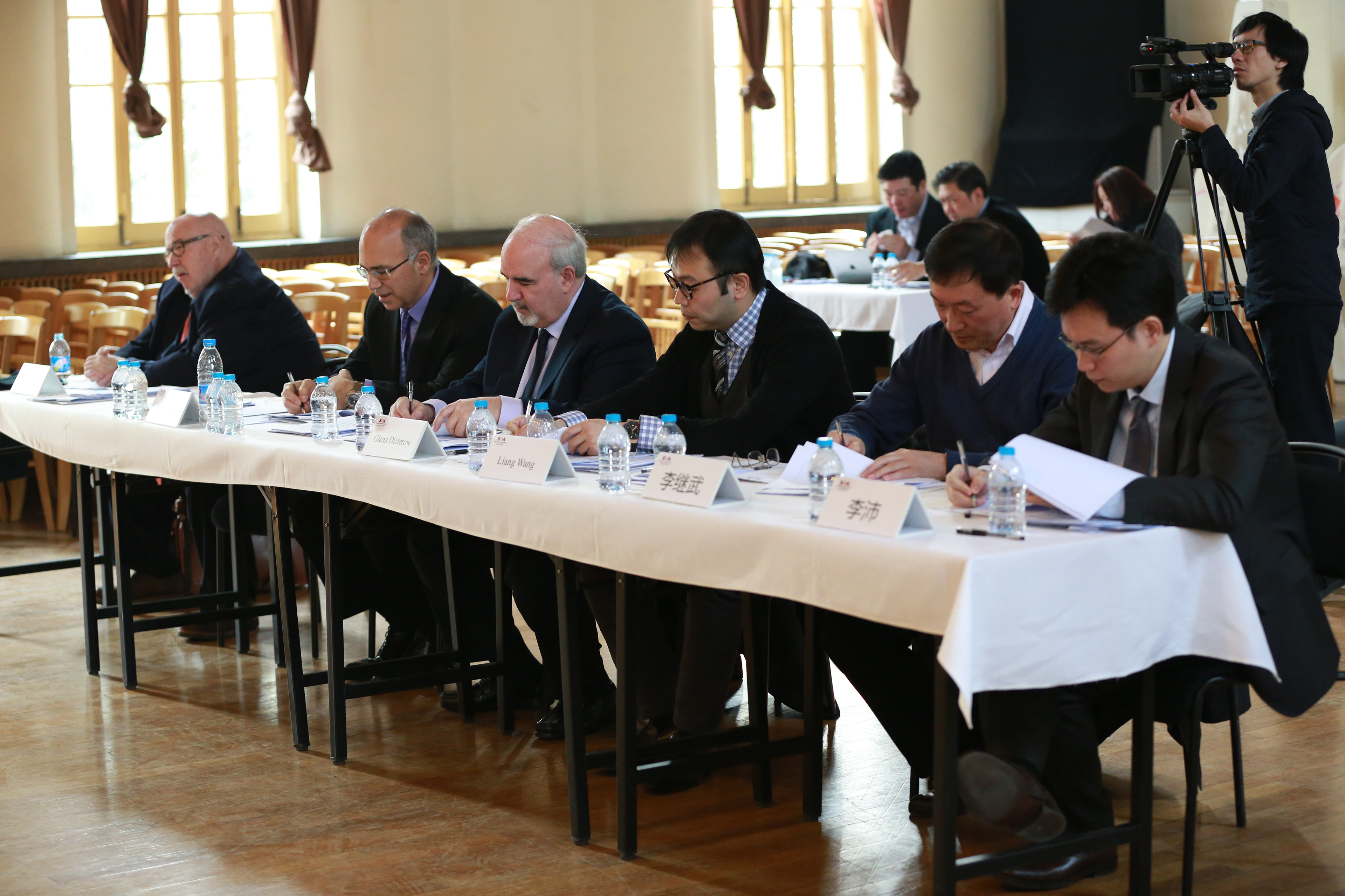 此次面試考官(從左至右):紐約愛樂樂團圓號首席菲利普.梅耶斯、長號首席約瑟夫.阿萊西、樂隊首席格蘭.迪克特羅、雙簧管首席王亮,以及上音弦樂系主任李繼武、上交首席李沛 。